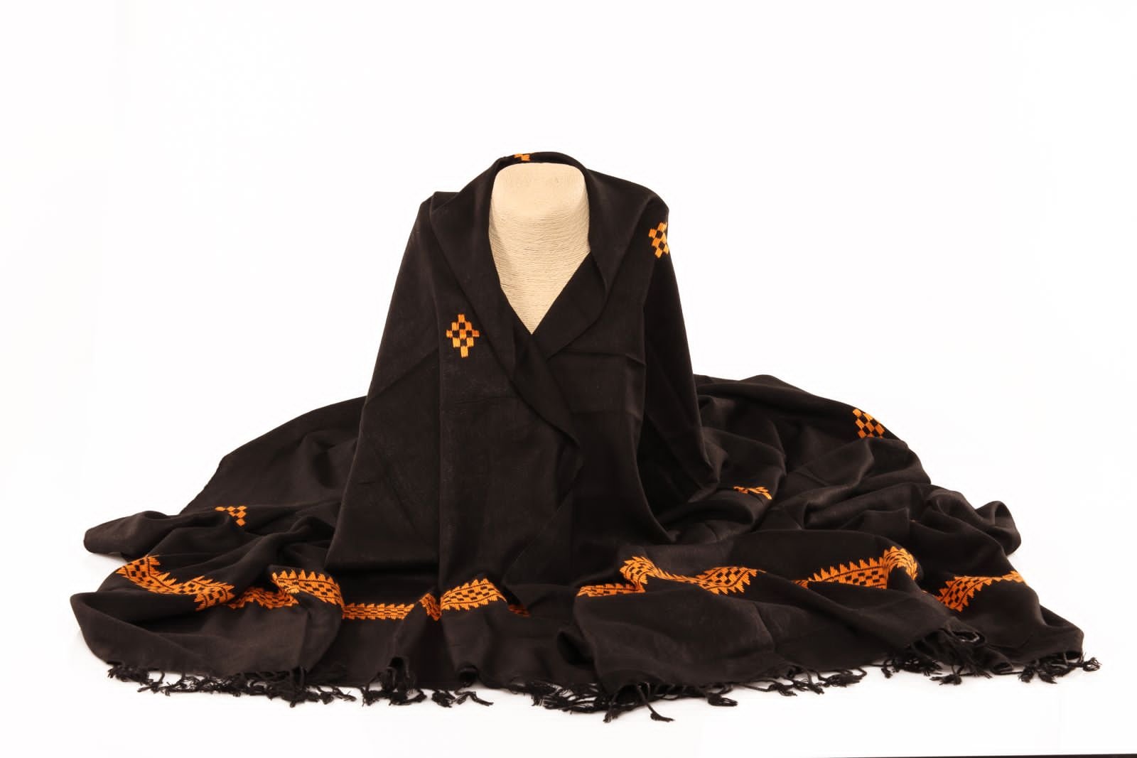 Made from  pure wool, this elegant black shawl features exquisite hand embroidery in vibrant orange geometric motifs, creating a striking balance between tradition and modern design.